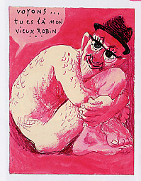 (...) Mais sachez qu'on a pris Brassens a son propre jeu en mettant en scène nos propres copains. Il y a nottamment Pascal Rabaté à qui je dois d'avoir rencontré David (Prudhomme, le dessinateur de La Tour des Miracles - NDPBE). Il a prêté - s'il on peut dire, puisqu'on ne lui a pas demandé son avis - son anatomie avantageuse à deux personnages antagonistes, Robin-La-Liste-Noire et le Président de la Secte Occulte des Masturbateurs Frénétiques.