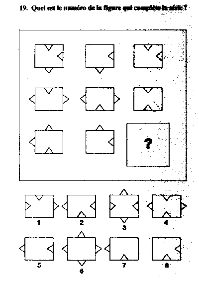 Logique du second graphique (si j'ai bon, y a peut-être plusieurs solutions) il faut superposer les deux premiers carrés de chaque ligne pour obtenir le troisième. Moi je suis parti du principe que les flèches dirigées vers l'intérieur restaient et que celles dirigées vers l'extérieur disparaissaient systématiquement (donc réponse 8) JC est parti du principe que les flèches dirigées vers l'extérieur s'annulaient uniquement quand on les superposait (donc réponse 2).