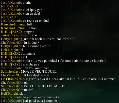 |  |  | Ah oui, j'ai aussi joué contre un mec qui m'a rushé au bout de 8 minutes avec ses archers en me disant ces mots doux "BYE BYE NOOB! SUCK AND FUCK YOUR MOTHER!!!".