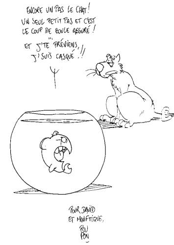 Quand à tes reproches, tu as raison, mais comme je suis myope et que je dessine à environ 2 millimètres de ma feuilles, je dessine très petit, je peux pas faire autrement (les gens doivent croire que je les arnaque en dédicace!!) D'ailleurs, tu me croiras si tu veux, mais les dessins de comme un poisson dans l'huile sont légèrement agrandis...