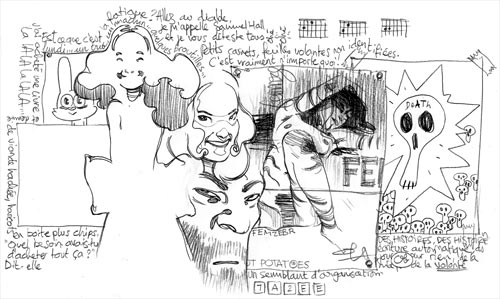 euh, bin en plus je vais critiquer un peu. Je préfère la version noir et blanc, sur les deux derniers dessins. Je saurais pas trop dire pourquoi, si ce n'est que peut-être c'est une techniquen que j'ai l'impression que tu emploies régulièrement, et qui du coup paraît moins originale, moins frappante. C'est pas que c'est raté, mais comme ça me donne l'impression de l'avoir déjà vue (par ex, le papier kraft, c'est chouette, mais maintenant, ça fait classique, chez toi), bin je préfère sans. Même si j'ai déjà vu aussi des dessins en noir et blanc, et je, euh... |