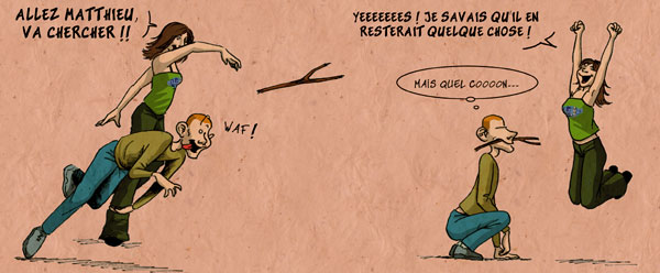 | |  |  | Matthieu, c'est un doberman, il attaque son maître pour le tester. (J'ose pas dire "sa maîtresse", ça pourrait créer une fâcheuse ambigüité.) :o) |