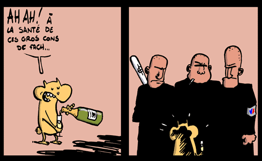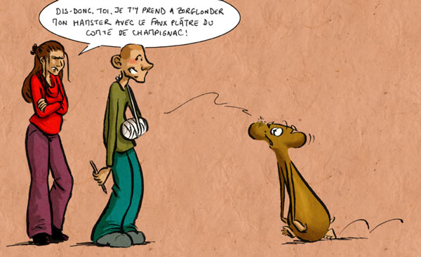 | |  |  | A propos, il y a là-dehors une délégation de Fache-Tumesniliens qui veulent faire la peau à ton hamster... |
