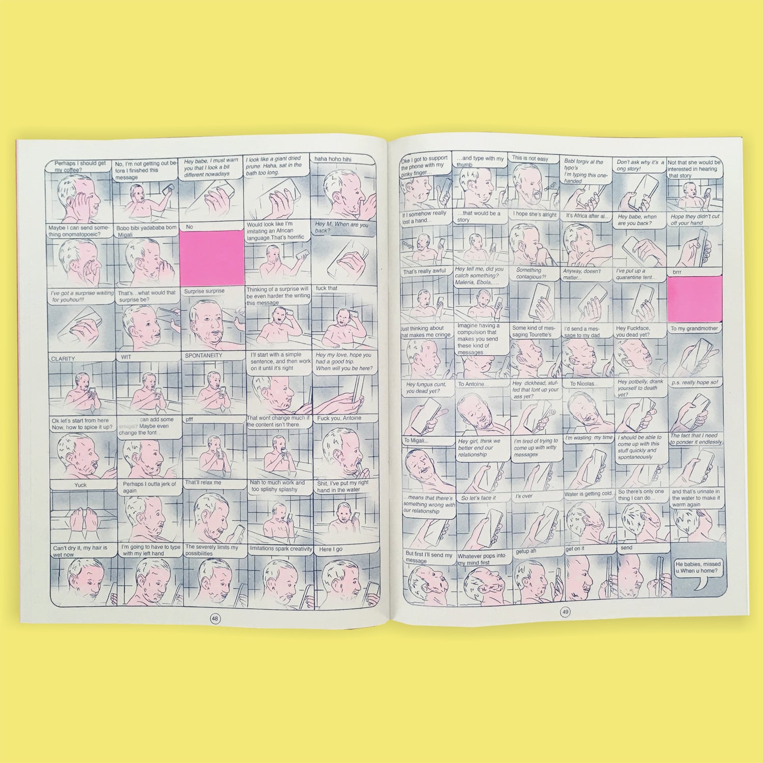 Tu peux commander sur le site, c’est du travail artisanal, petits tirages (500 exemplaires, réédités régulièrement), avec des couleurs pimpantes en riso. Je pense que Schrauwen est au sommet de son art en terme d’ampleur, de richesse du propos, de système narratif, d’esthétique et d’émotion. Vas-y quoi !