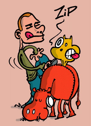 | |  |  | Ah oui, classique le truc qui se coince dans la tirette (pardon, fermeture éclair). Classique mais efficace. Il est pas Jovial, le Hamster. |