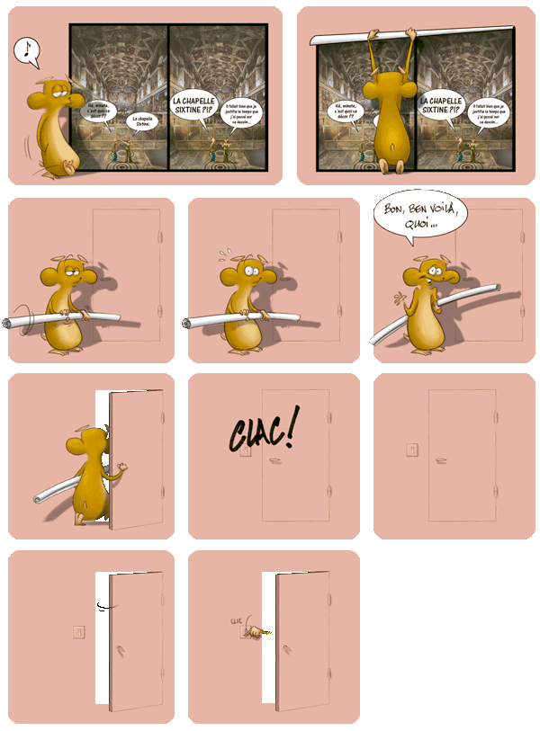 | |  |  | moi qui croyait tous ces artistes dispensés des petites viviscitudes de la vie quotidienne, me voila avec un michel ange avec de la peinture dans le slibard... au fait ils avaient des slips a l'epoque? ayons une pensée pour ces peintres de l'epoque qui ne connaissaient pas la peinture dulux valentine satinée qui coule pas dans le slip...